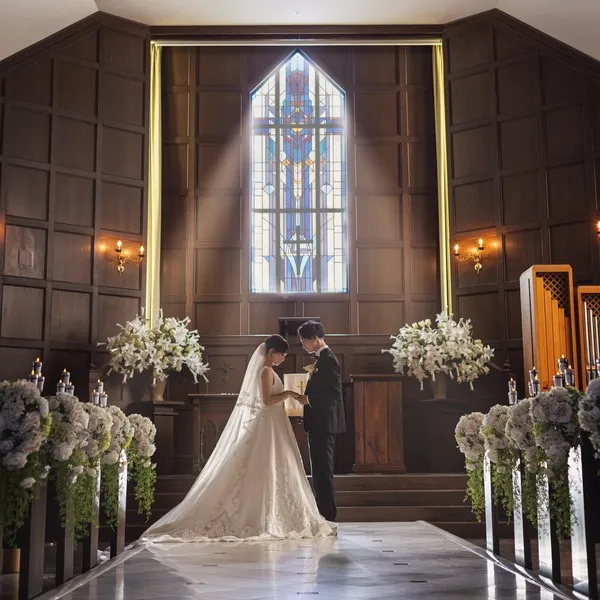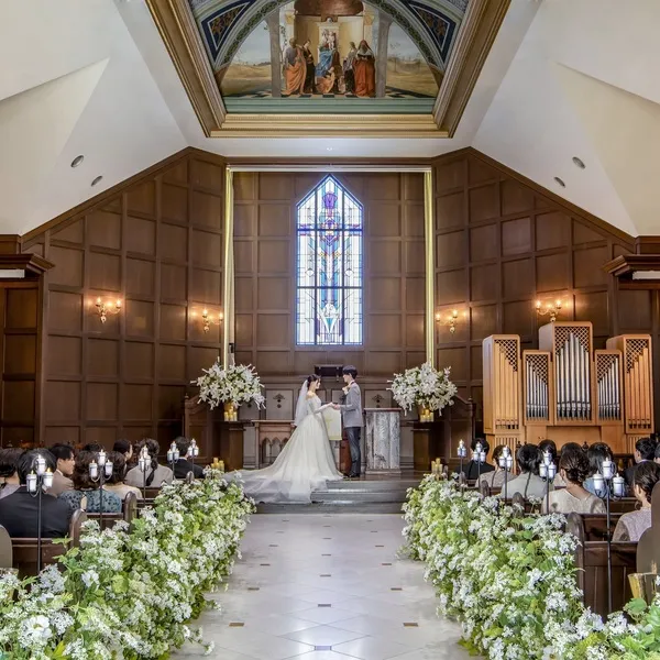 青く大きな空を背景に美しく映える純白の教会は圧巻!県内でも圧倒的なスケールでゲストの感動を誘います ステンドグラス輝く温かでクラシカルな雰囲気をぜひ体験して♪フェア当日は入場体験や演出体験も!